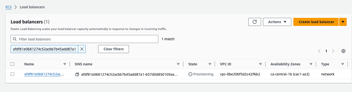 NAME TYPE CLUSTER-IP EXTERNAL-IP PORT(S) AGE kubernetes ClusterIP 10.96.0.1 <none> 443/TCP 14m nginx-service LoadBalancer 10.96.177.89 afdf81e0681274c52acbb7b45add87a1-637d0d850105ea92.elb.ca-central-1.amazonaws.com 80:32927/TCP 63s