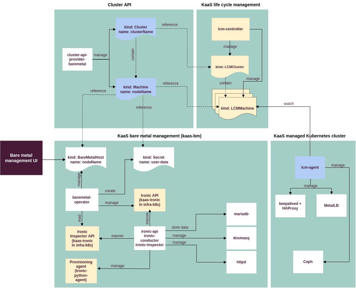 The bare metal management solution for MOSK includes the following components: