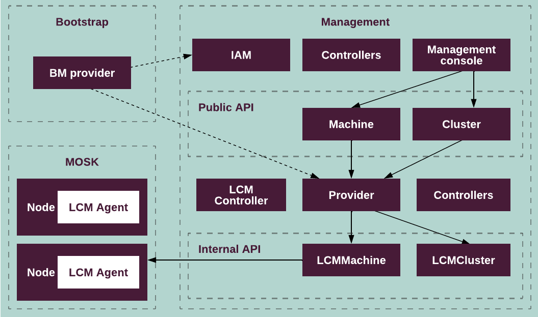LCMMachineandLCMCluster. Also, it runs an LCM controller for orchestrating MOSK clusters and other controllers for handling different resources.Requires two-way access to the bare metal provider backend. The provider connects to a backend to spawn MOSK cluster nodes, and the agent running on the nodes accesses the management cluster to obtain the deployment information.