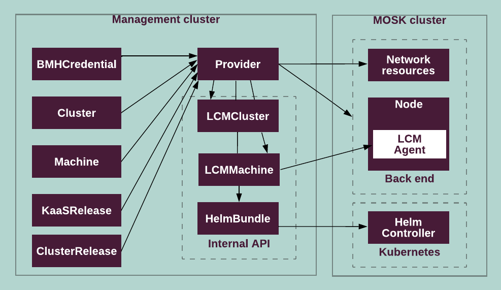 MOSK bare metal provider provisions nodes of management and MOSK clusters and runs the LCM Agent on these nodes. It runs in a management cluster and requires connection to the bare metal provider backend.