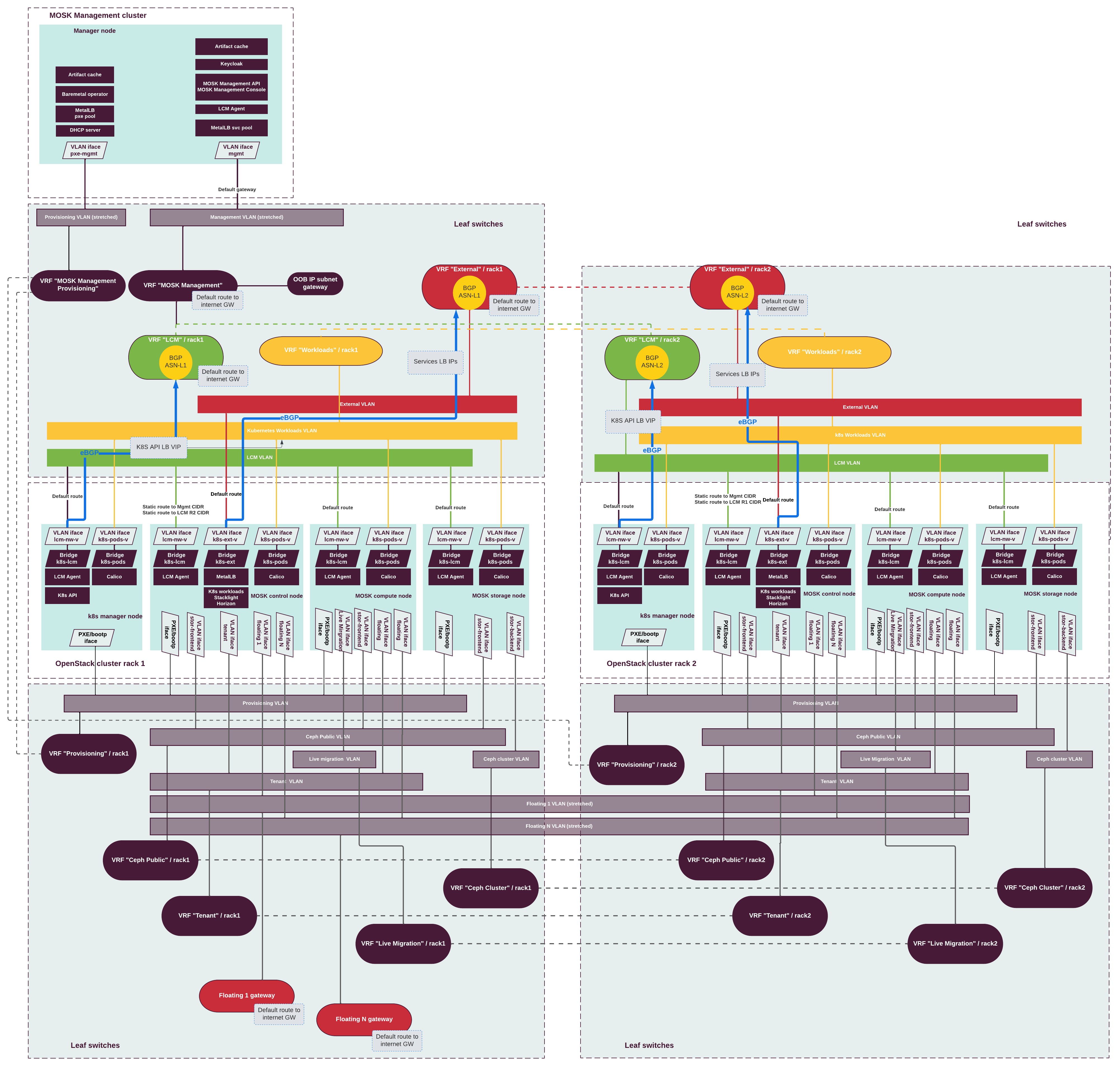 MOSK supports full L3 networking topology in the Technology Preview scope. The following diagram illustrates the networking schema of a management cluster deployment on bare metal with a MOSK cluster using BGP announcements: