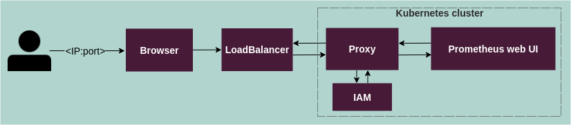 The public IP leads to IAM proxy, deployed as a Kubernetes LoadBalancer, which protects the Prometheus web UI.